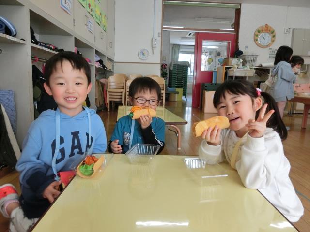 ひよこぐみは『おもちゃのチャチャチャ』、つくしぐみは『おべんとバス』、たんぽぽぐみは『エビカニクス』のお遊戯や歌のプレゼント。