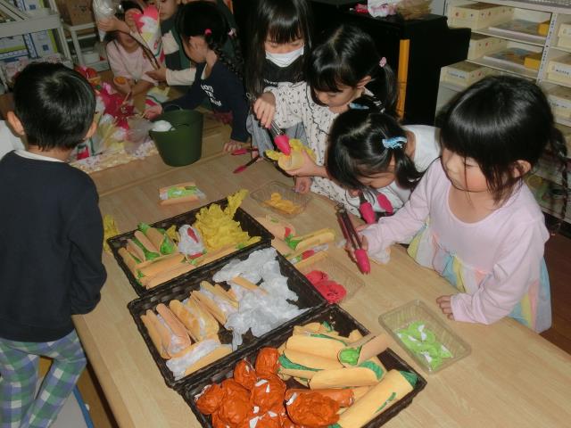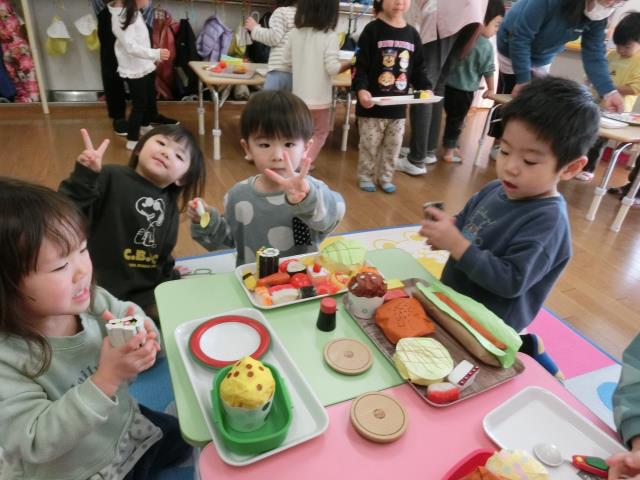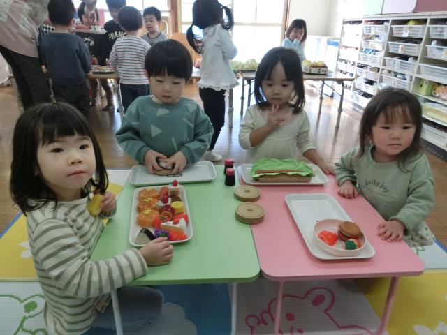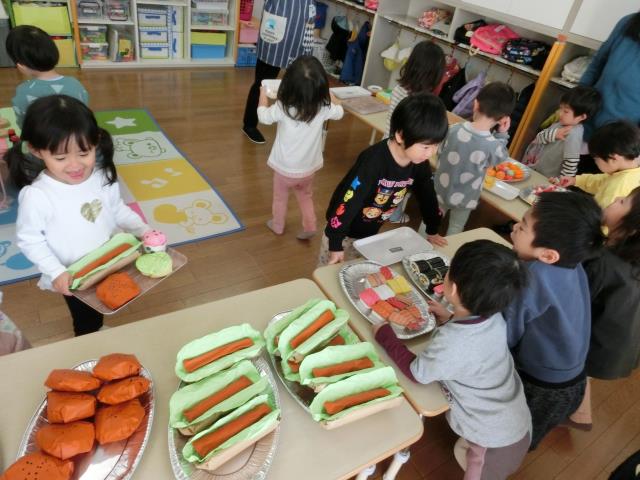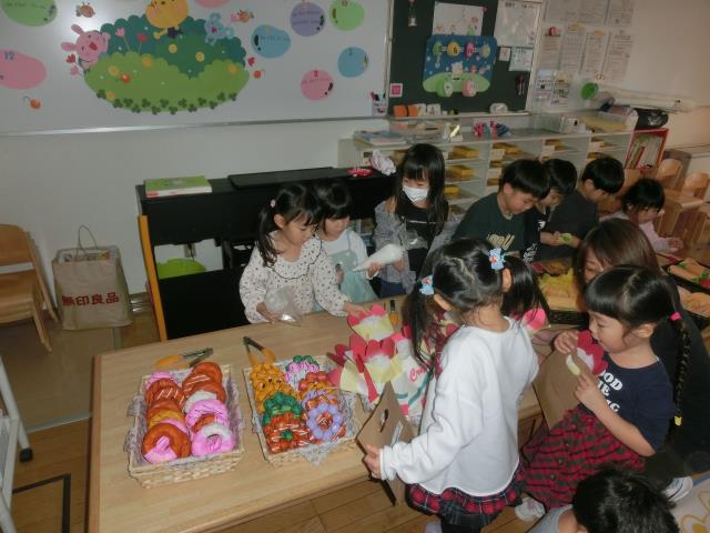 ドーナツ屋さん、クレ-プ屋さん、ホットドッグ屋さんを友だち同士でお店屋さんとお客さんに分かれて楽しんでいましたよ。