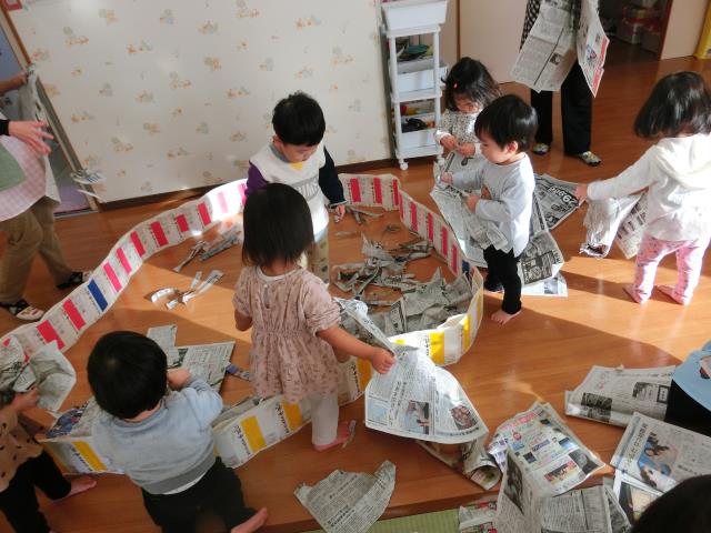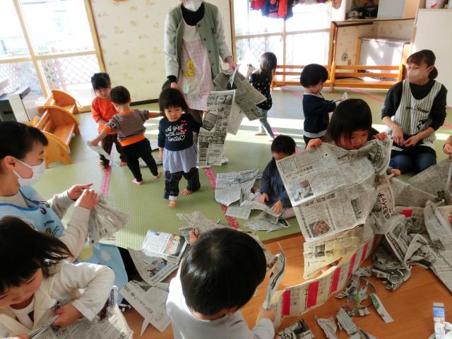 今日のつくしぐみは、お部屋で新聞あそびをしています!