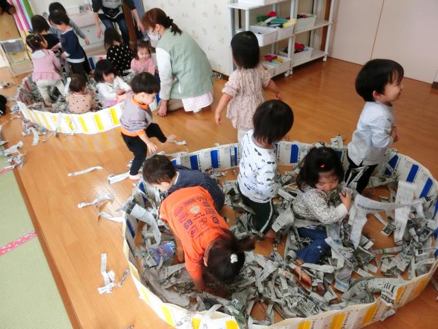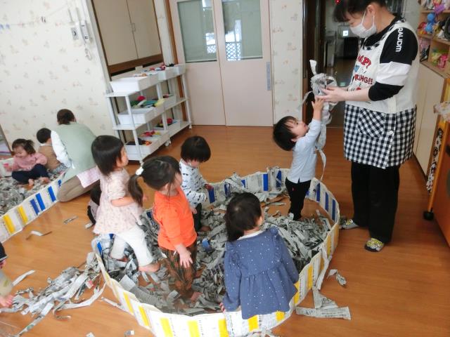 みんなで新聞をビリビリやぶいたり、新聞の雨を降らせたり。
