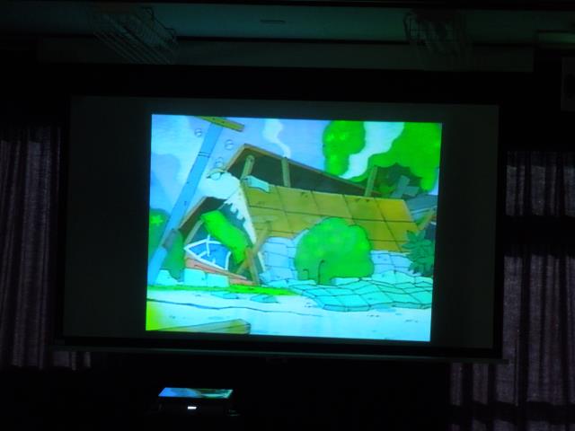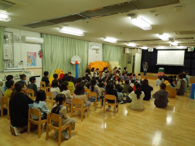 今日は避難訓練を行い、ホールで地震のビデオ「ちびまる子ちゃんの地震を考えよう」を見ています。