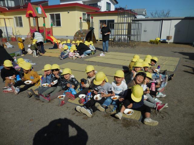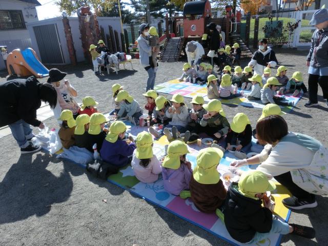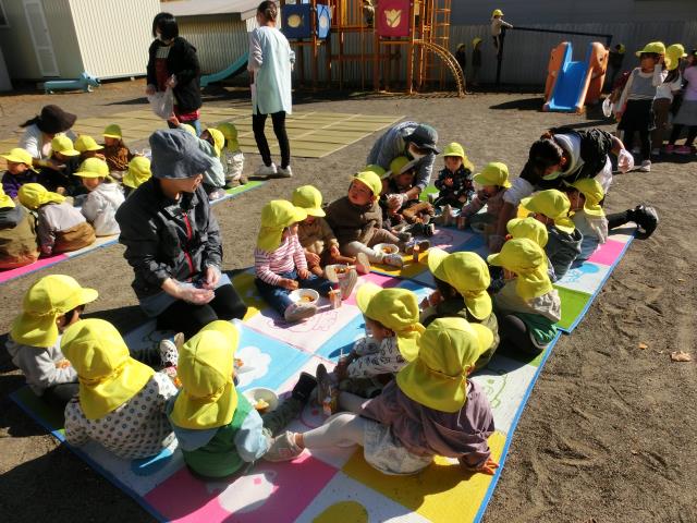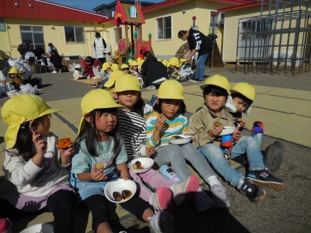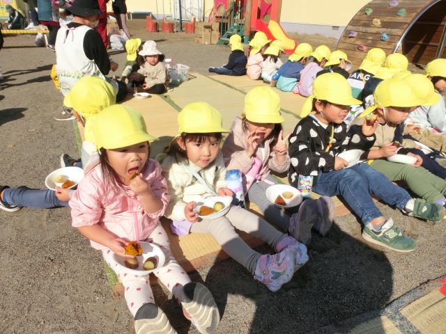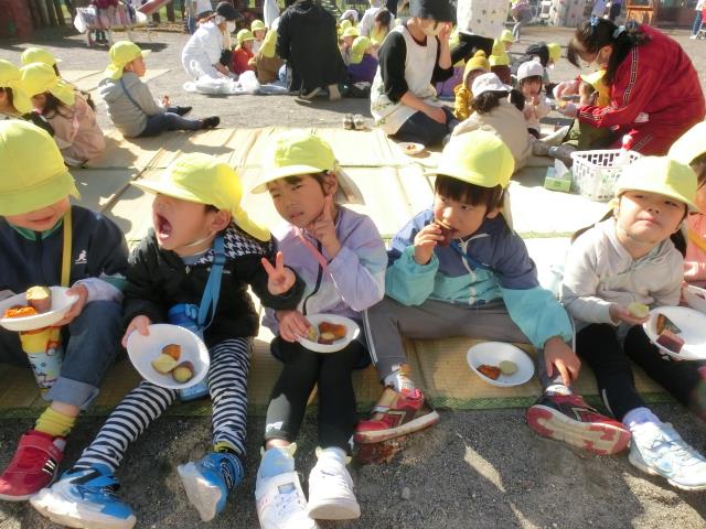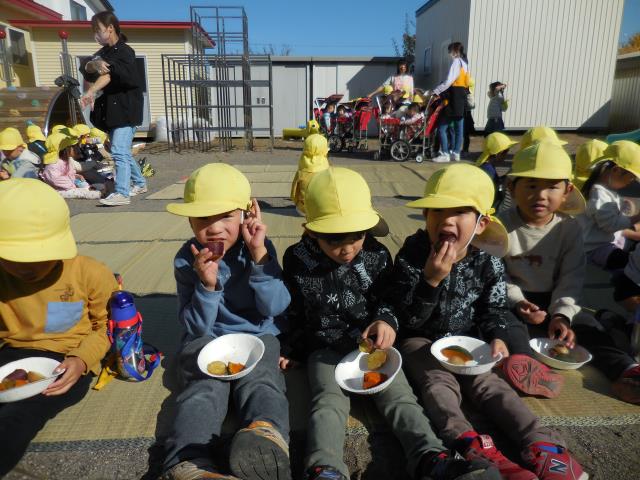 ちゅうりっぷぐみ・さくらぐみ、そしてひまわりぐみ(一時預かり保育のお友だち)も美味しそうに、さつまいもやじゃがいも、かぼちゃを食べていましたよ。