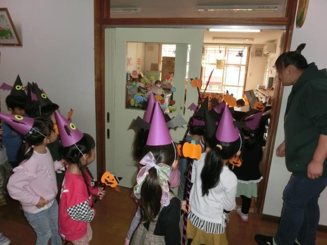 今日のさくらぐみは、ハロウィンの日という事で、仮装をして「ハッピーハロウィン」と言いながら園内を回っています。