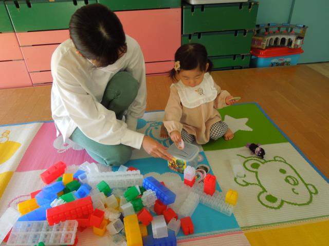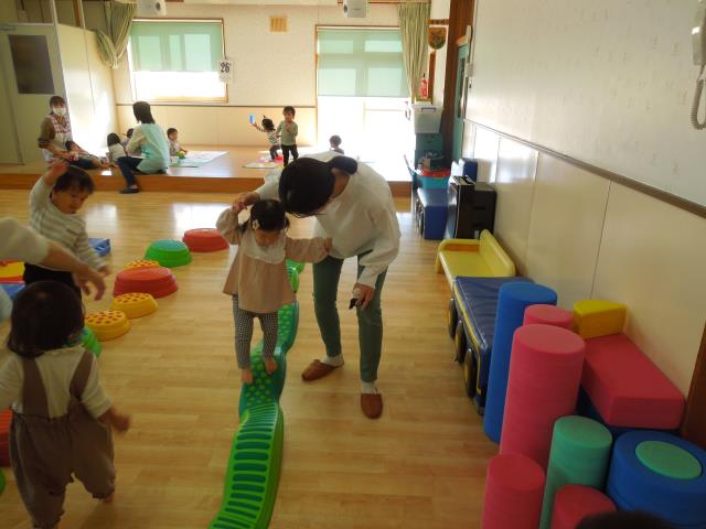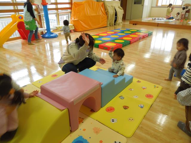 ひよこ・つくし・ひまわりぐみさんのお友だちと一緒に、ホールで体を動かしたり、ブロックで遊んでいます。