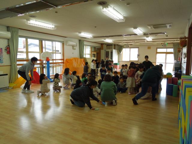 ひよこぐみさんとひまわりぐみさんと一緒に、ホールで遊びましたよ。