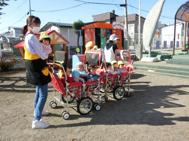 ロングコースでは、たんぽぽぐみさんとつくしぐみさんが手を繋ぎ、ベビーカーのひよこぐみさんも一緒に散歩しています。