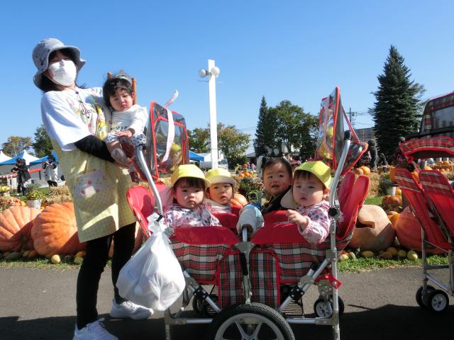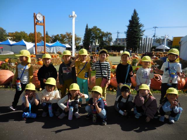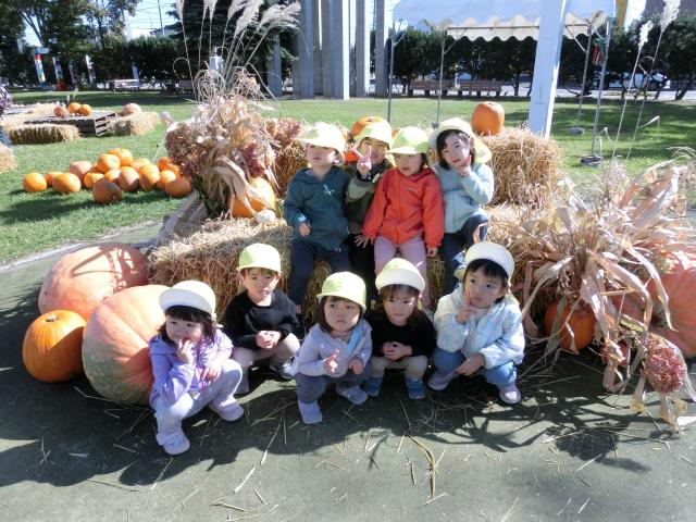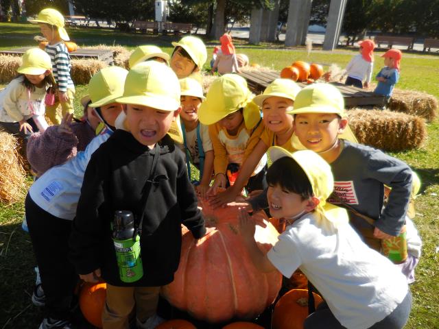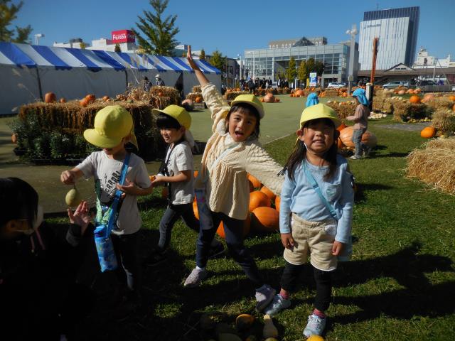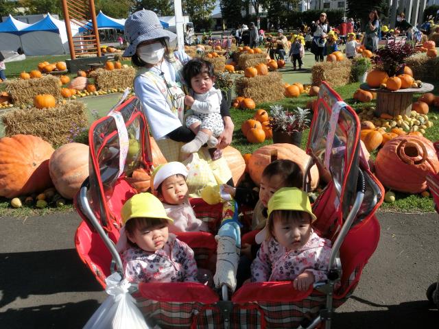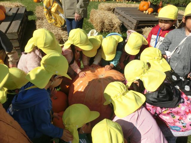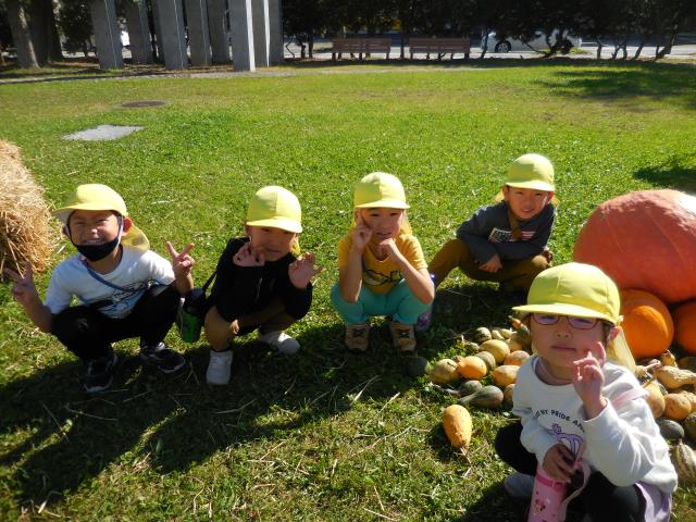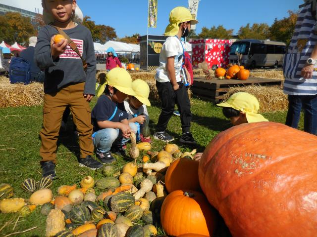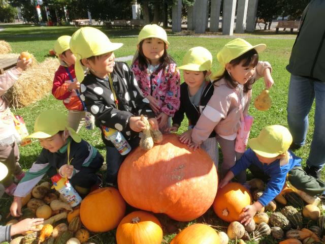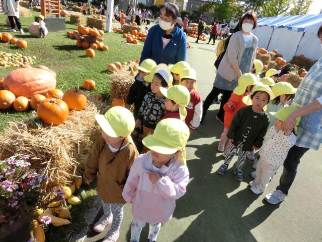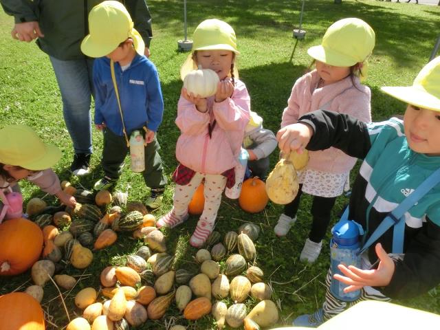 色も形も大きさも様々なカボチャがたくさんあり、じっと見たり嬉しそうにしていた子ども達です。