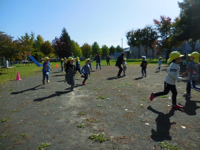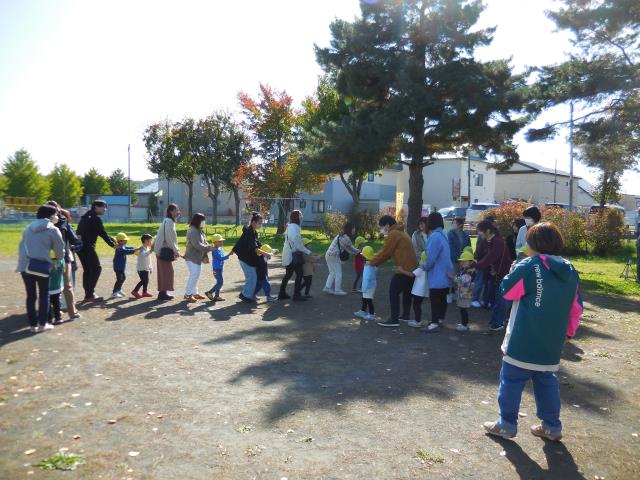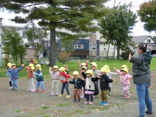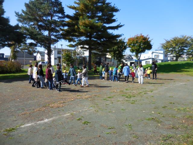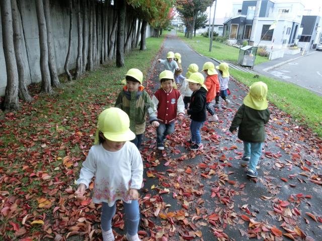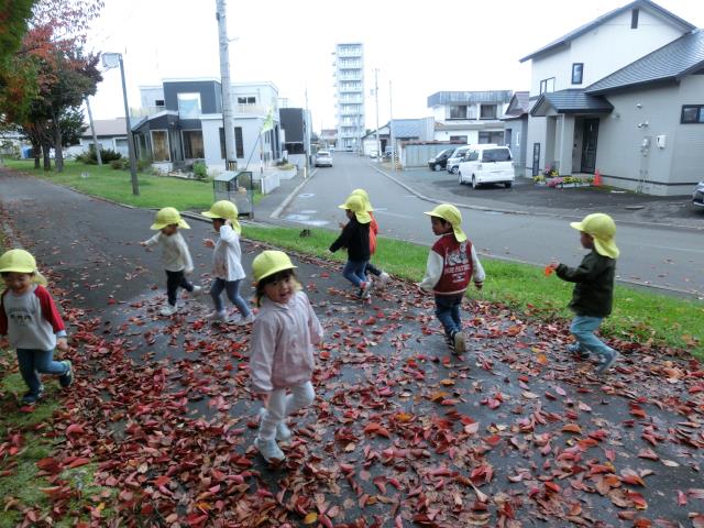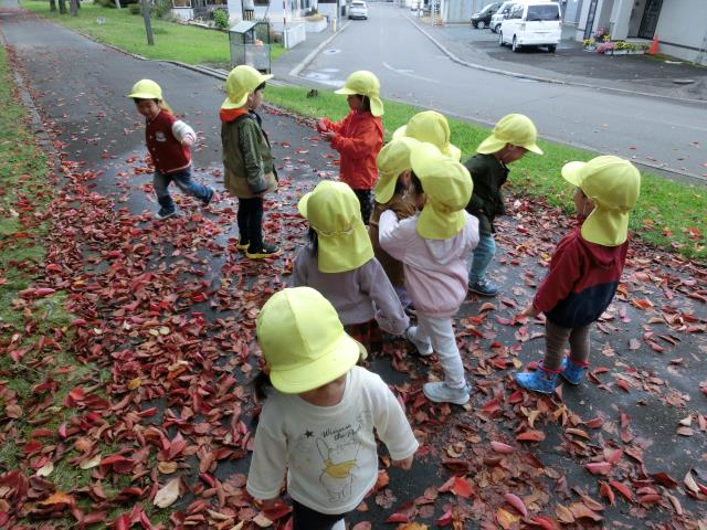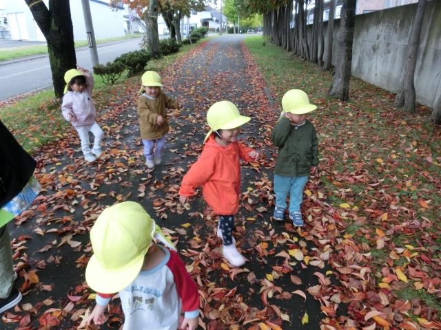 緑いっぱいだった葉の色が変わっている事に気付き、「黄色だよ!」「あっちは赤だー!」と盛り上がっていました。