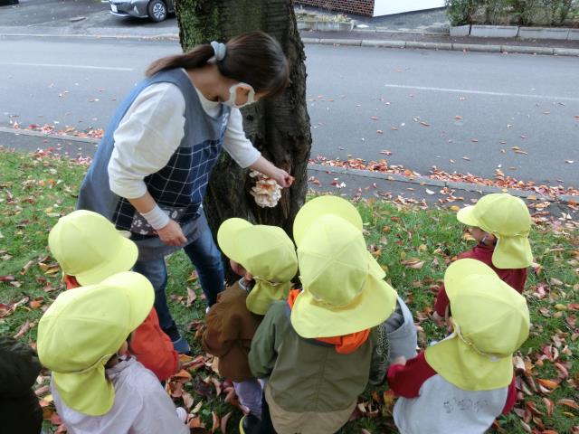 大きなキノコを発見したり、落ち葉の上を歩いて音を楽しんでいましたよ。