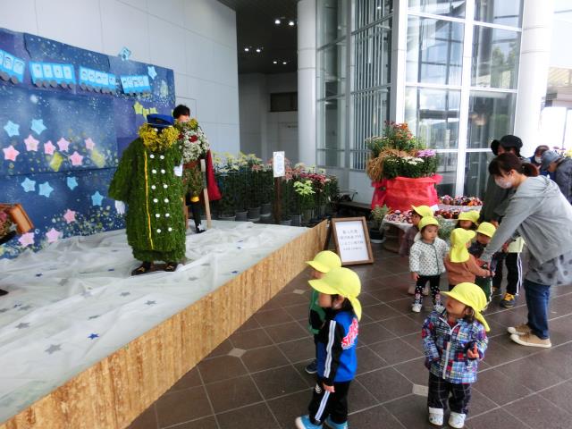 プロムナードの菊人形や玉ねぎの置き物(オブジェ)にも、興味津々な様子の子ども達でした。