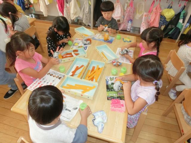 新聞紙を丸めて折り紙で包んだり、のりを付けた折り紙をリングドーナツに巻き付ける姿は職人さんです!!