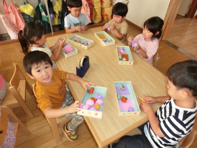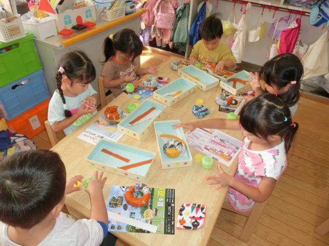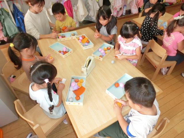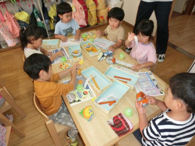 洗濯バサミあそびでは、集中している様子が見られたり、お弁当並べでは、好きな具材を集めてオリジナルお弁当を作っているお友達もいましたよ。