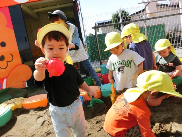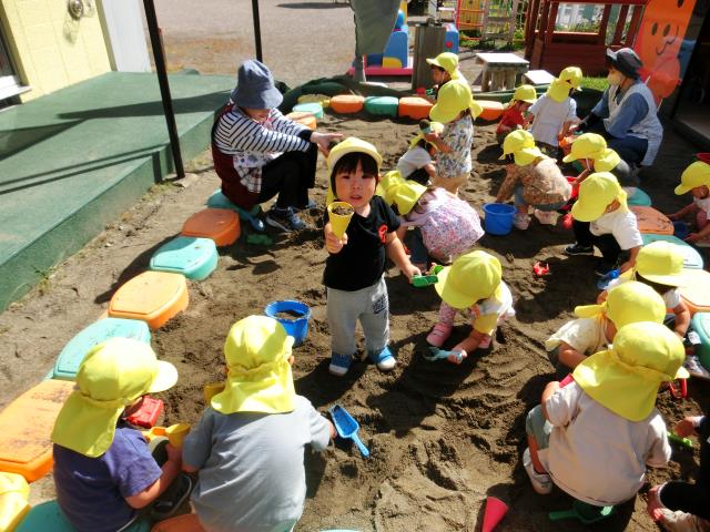 砂遊びを始めるとアイスクリームを作ったり、アンパンマンやバイキンマンのお顔の型を取ったり、先生と大きなケーキをつくるなどして、楽しく遊びました!!