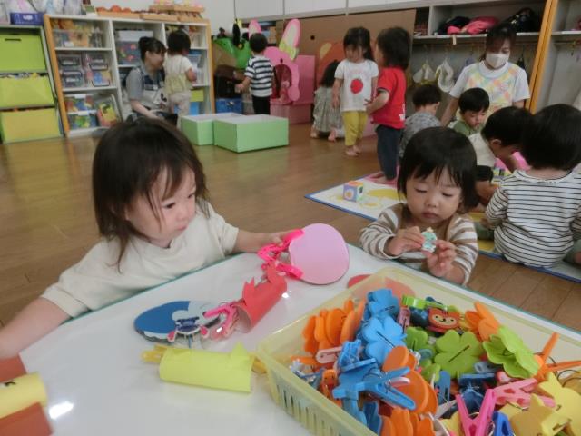 たんぽぽぐみのお部屋では「洗濯バサミあそび」や「お弁当並べ」、うさぎさんやくまさんに果物を食べさせて楽しんでいます。