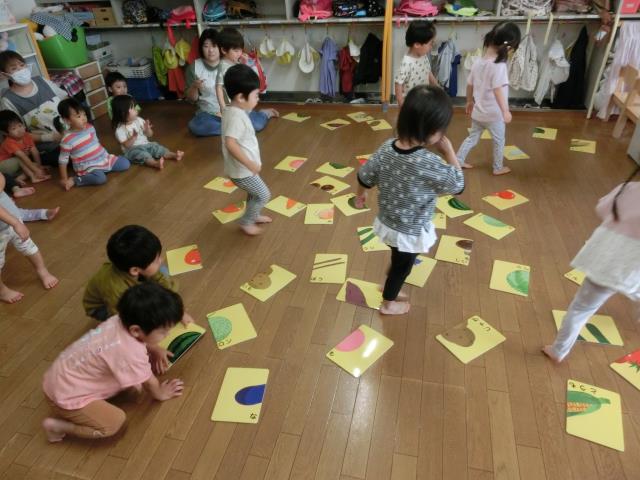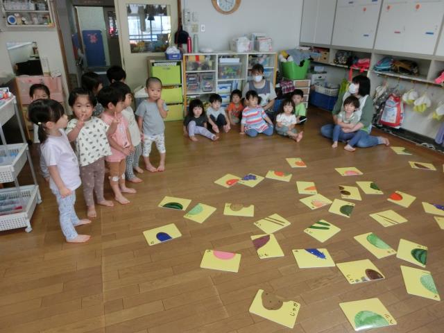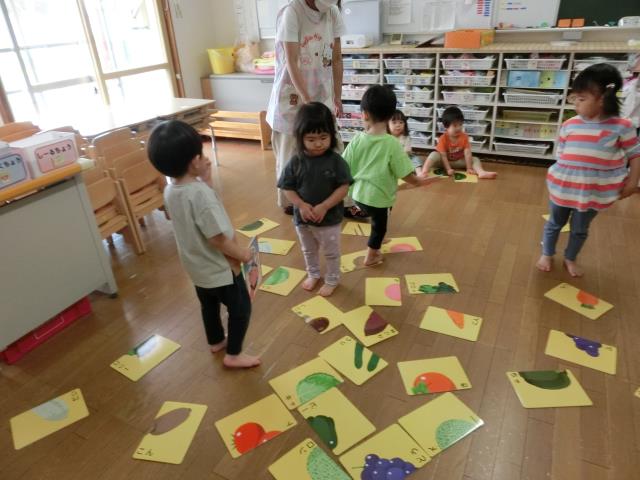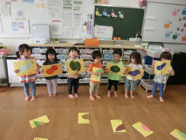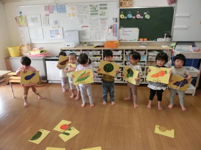 たくさんあるカードの中から組み合わせて、野菜や果物を完成させ、みんなで答え合わせをしています。