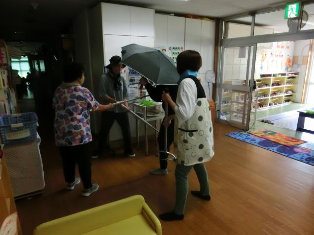 不審者が中へ入ってくると、ドキドキしたようですが、先生達がさす又で捉えると、ホッとした表情の子ども達でした。