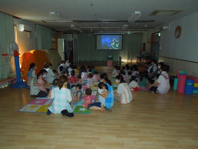 元気よく盆踊りを踊り、ホールで七夕についてのDVDを観ています。