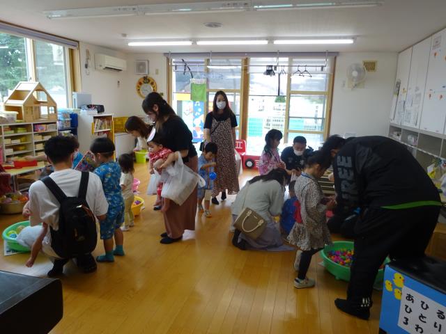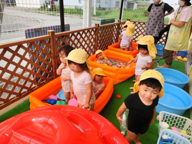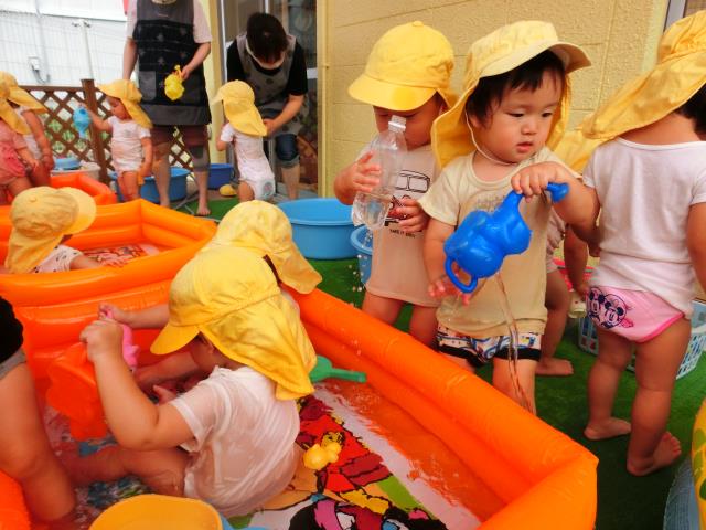 先生に水をかけて「ニヤッ」と笑ったり、じょうろや魚すくいをしたり、温泉のようにゆったりとつかったり、それぞれに楽しそうに夏のあそびを満喫したつくしさんです。