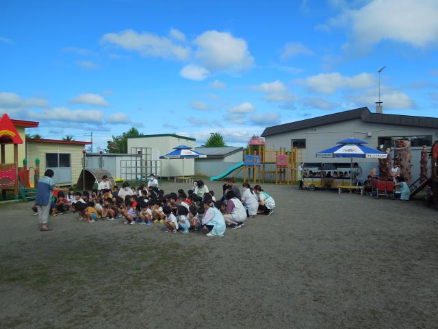 起きてすぐの事だったため、まだ眠そうなお友だちもいましたが、ベルが鳴ると上手に靴下や外靴を履いて、園庭に避難する事ができましたよ。