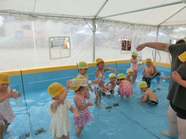 ペットボトルの水鉄砲やシャワーを使って、お友だちと水をかけ合ったりしながら、水の感触を楽しんでいます。