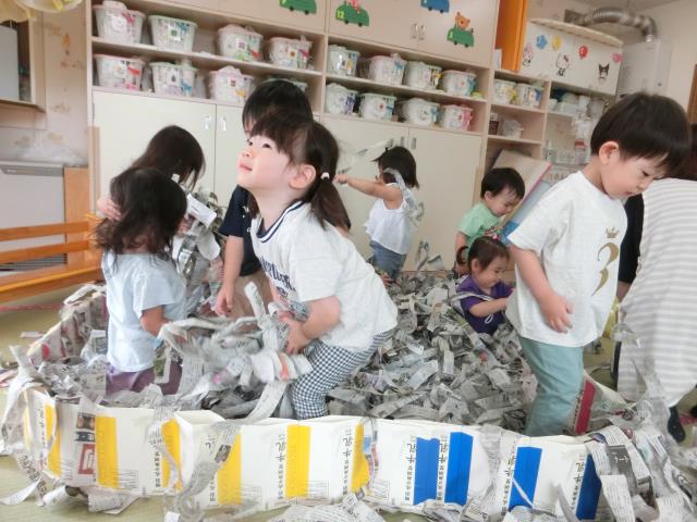 つくしさんのお部屋では、新聞プール・風船クッション・玉が転がる手作り玩具があり、体を動かしてのびのび遊んでいます。