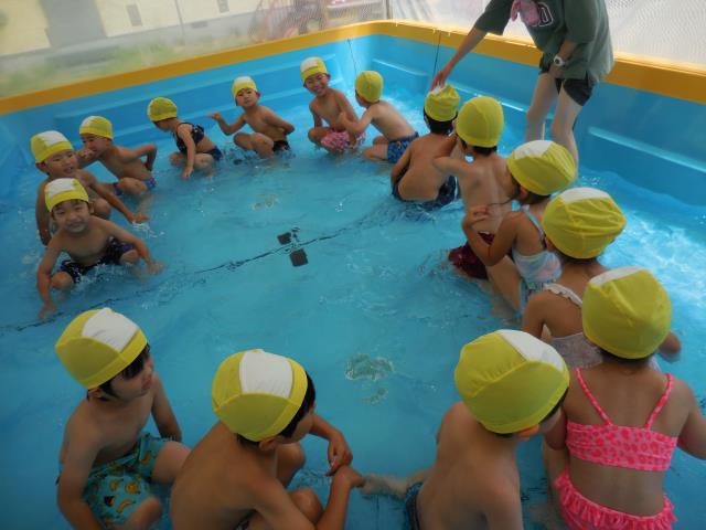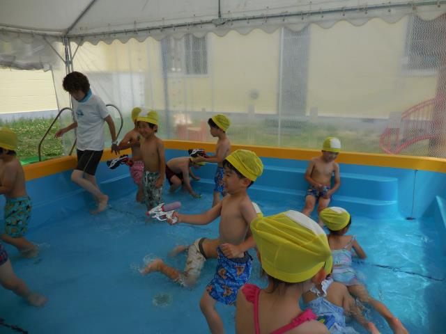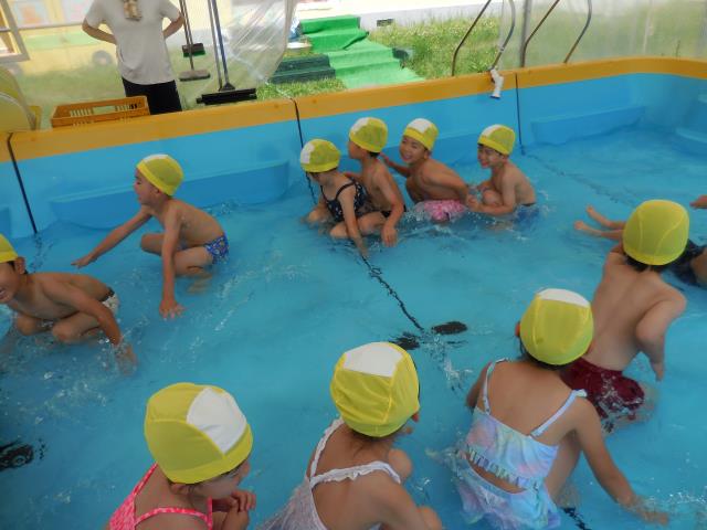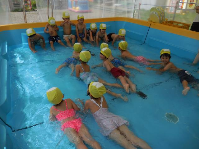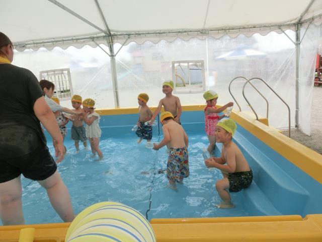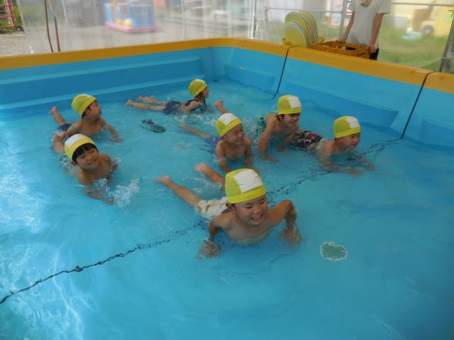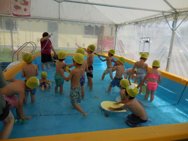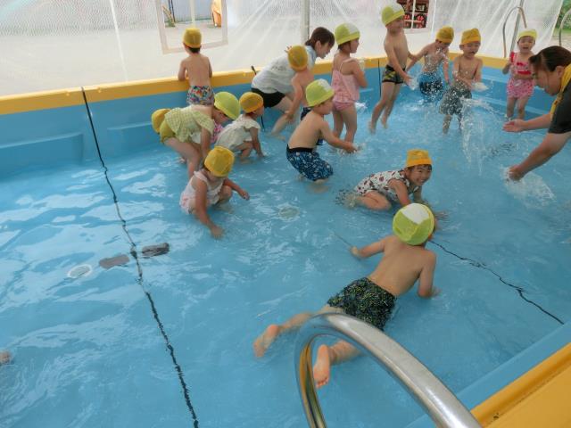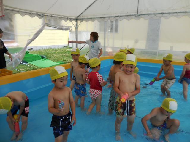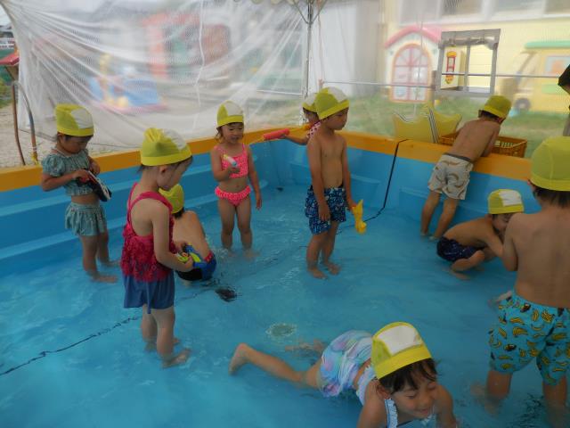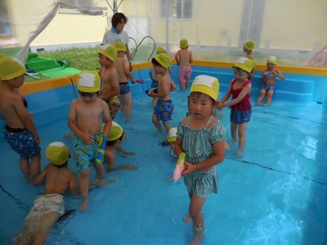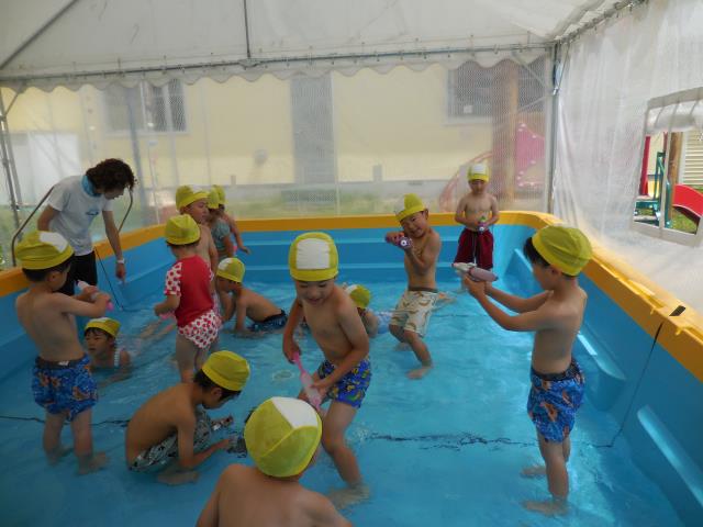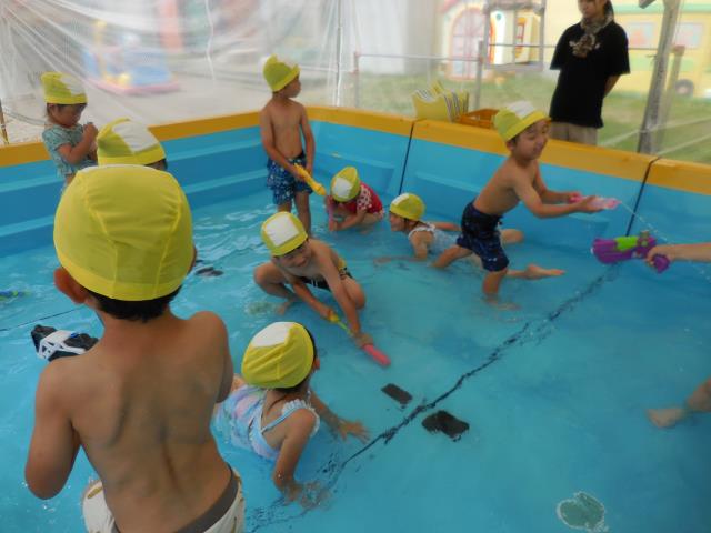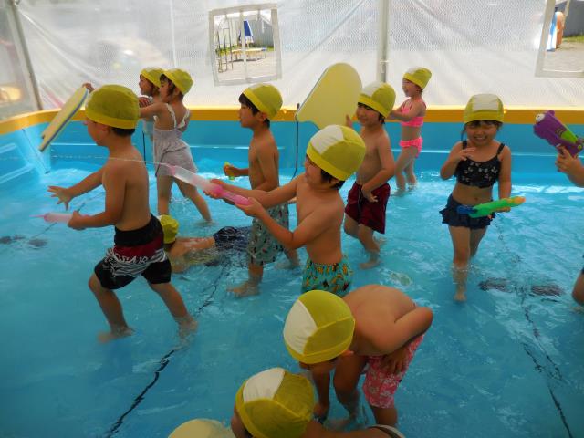 ワニ歩きをして楽しんだり、水鉄砲で撃ち合ったり、水のかけ合い等をして遊んでいます。