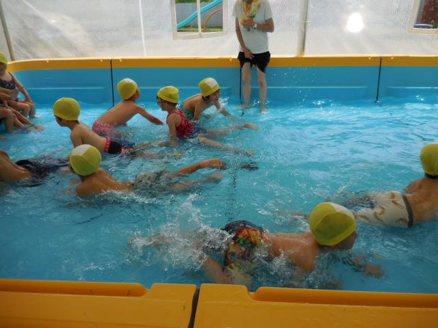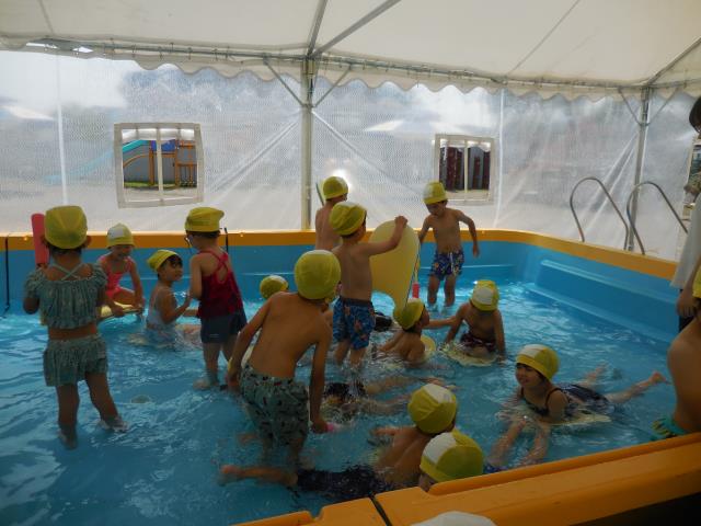 プール内でアヒル歩き、ワニ歩きをしたり、水鉄砲やビート板で遊び楽しんでいた子ども達です。