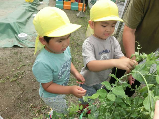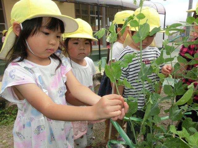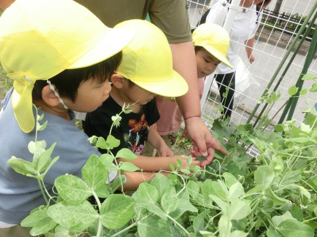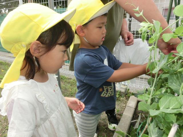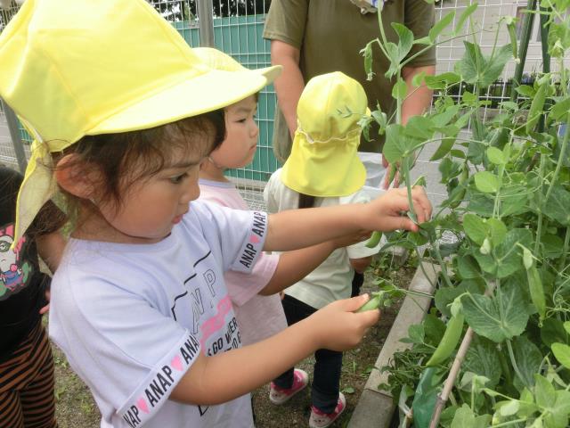 沢山実ったスナップエンドウを1人2つずつ収穫。