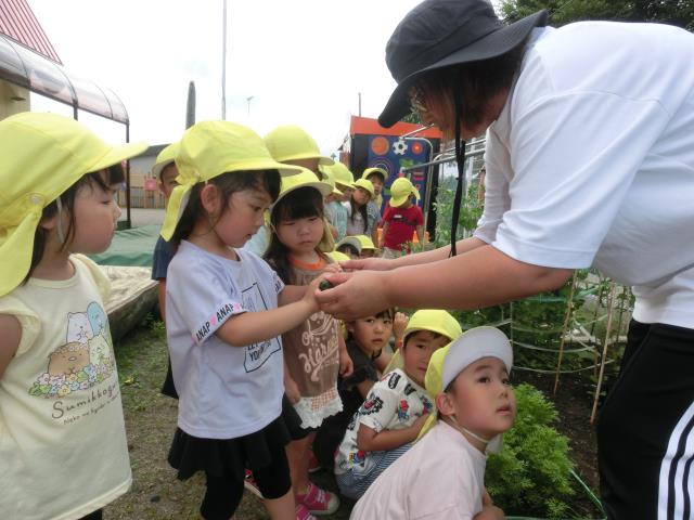 今日のちゅうりっぷぐみは、5月より大切に育ててきた畑の野菜が実り、なす2本ときゅうり1本を収穫しました!!