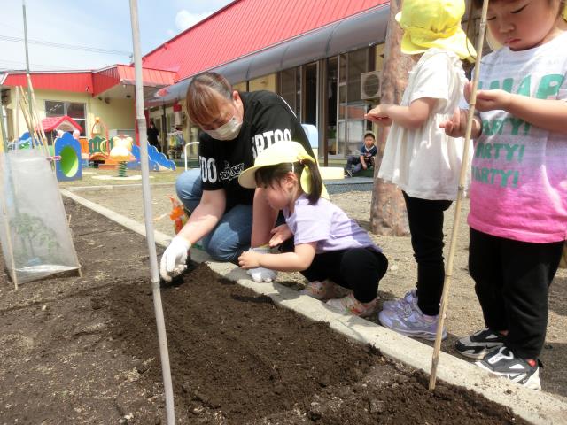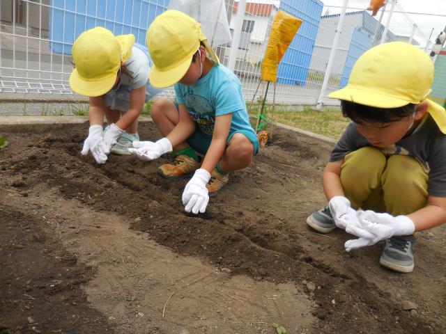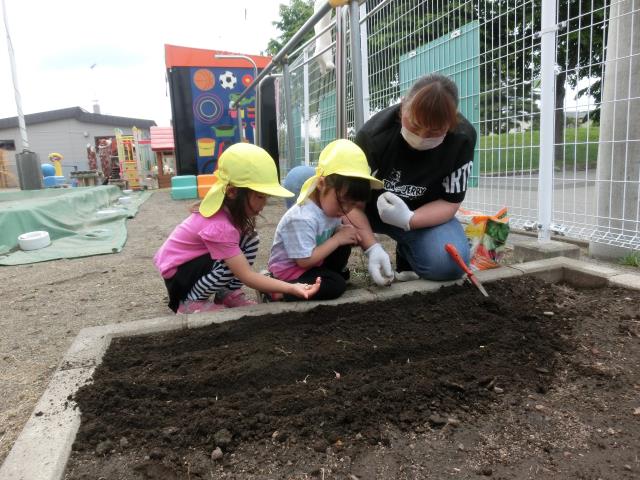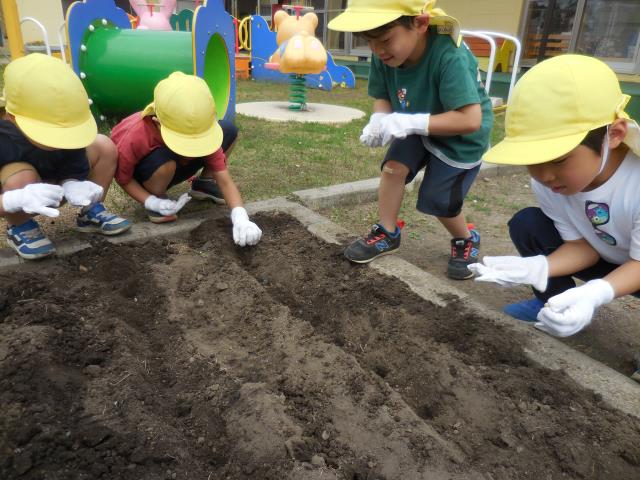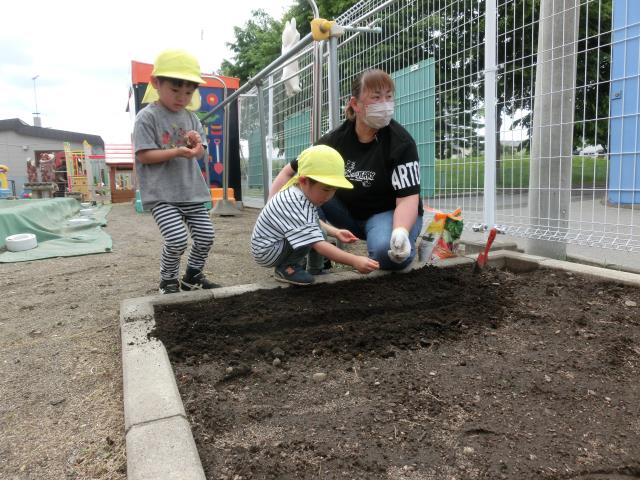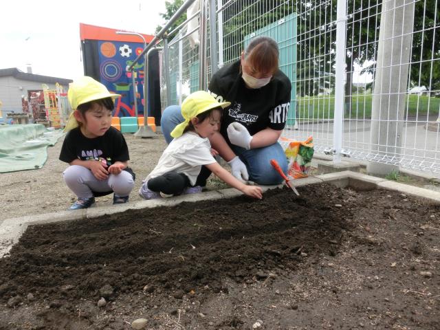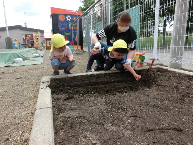 今日のちゅうりっぷぐみは、みんなで育てる野菜の苗や種を畑に植えています。