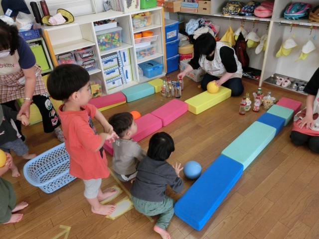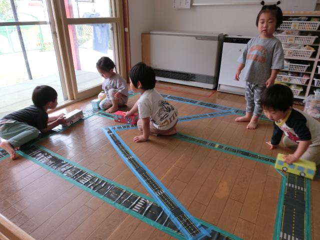 たんぽぽぐみでは、ボーリングや魚釣りといったゲームや、車にお人形を乗せて広い道路を走らせて遊んでいます。
