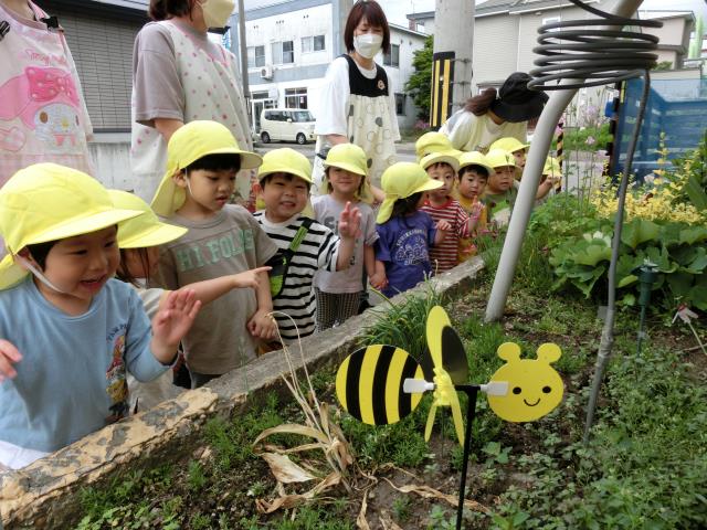 水分補給をしっかりして散歩へ行くと、ハチや様々な模様の風車と置き物があり、見て楽しむことができました。