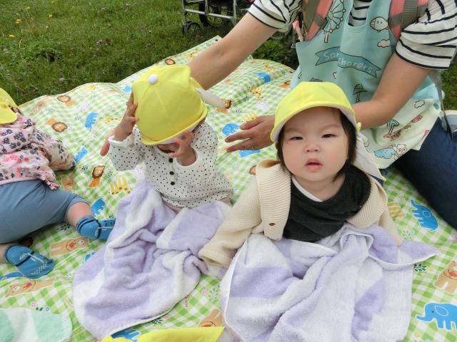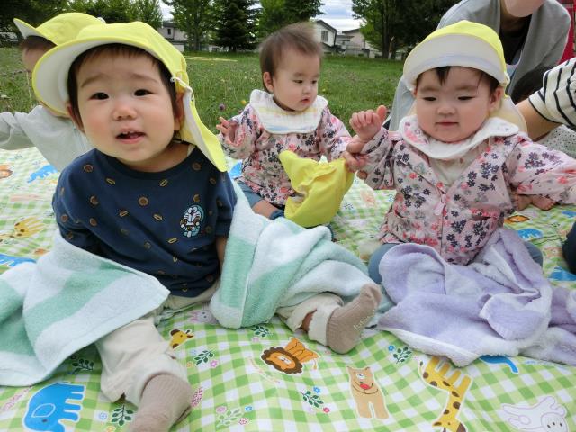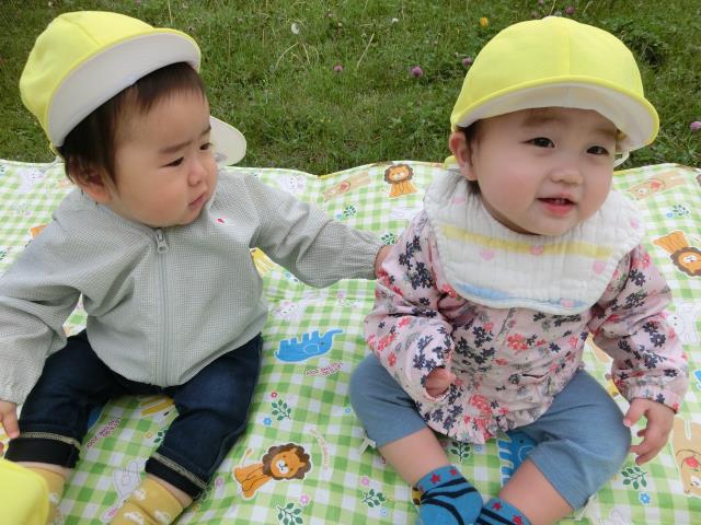 なかよし公園では、シートに座って休憩したり、ハイハイしたりして楽しく過ごしています。