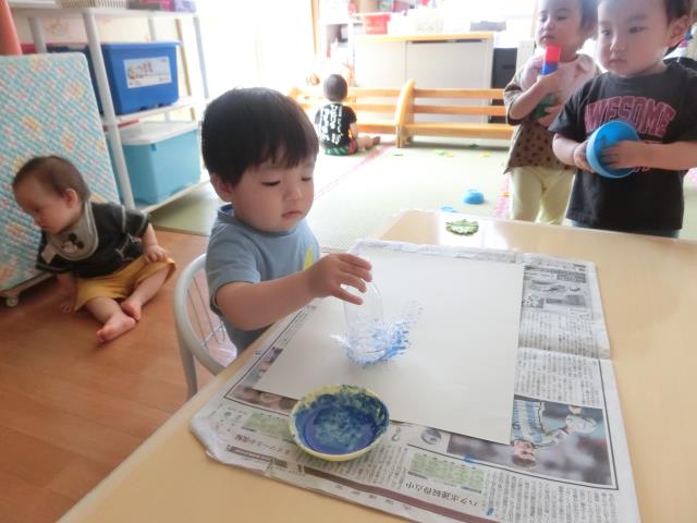 今日のつくしぐみは、6月の製作でエアパッキンに絵の具をつけた、スタンプ押しをしています。