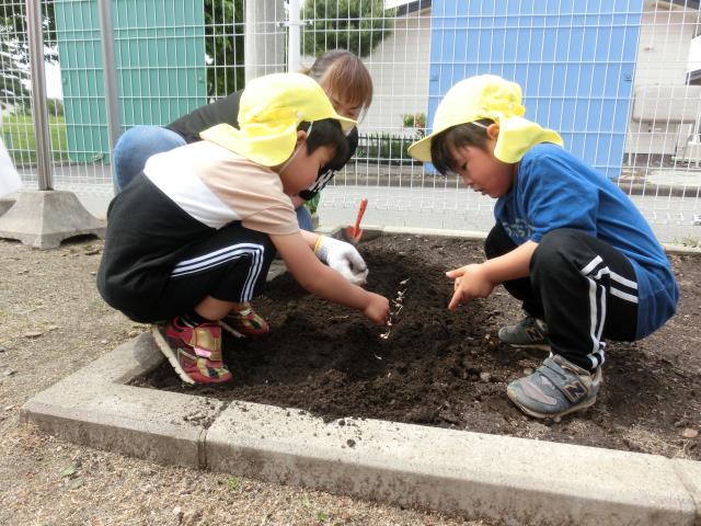 今日のさくらぐみは、枝豆とラディッシュの種をまきました。