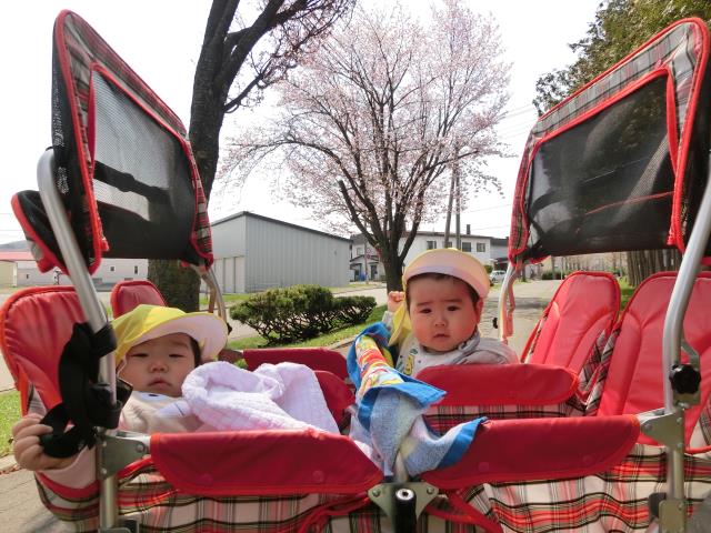 そして、今日は初めてベビーカーに乗って、お散歩をしています。
