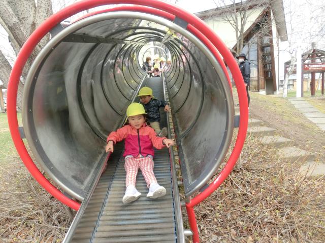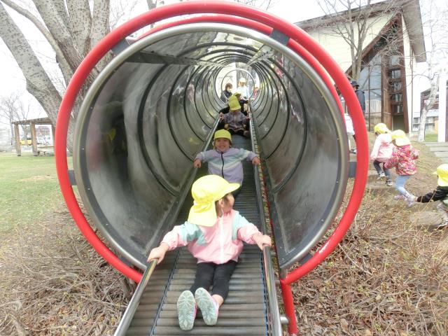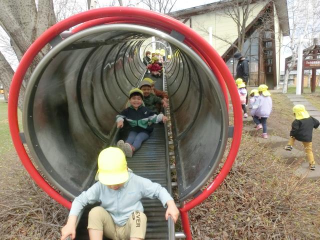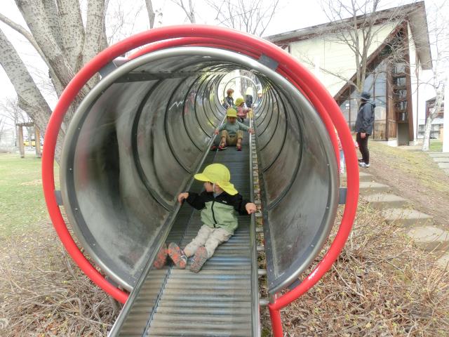 芸文前広場では、念願のローラー滑り台に乗って大喜び!!