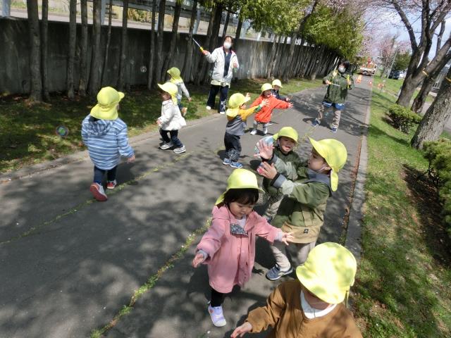桜を見た後は、しゃぼん玉をしています。