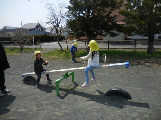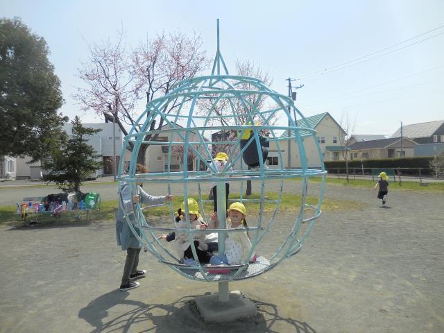 ブランコ・滑り台・回転ジャングルジム・シーソー・ジャングルジム・鉄棒があり、それぞれ好きな所で遊んで楽しんでいます。