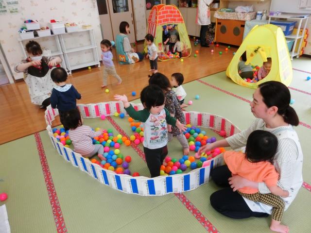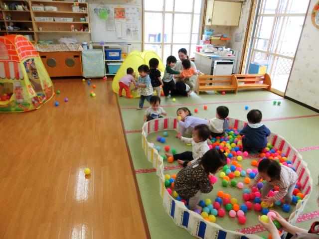 今日のつくしぐみは、お部屋にカラーボールのボールプールを出して遊びました。