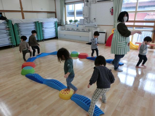 JPクッションとバランスストーンの上をピョンピョン跳ねたり、バランスを取りながら渡っていた子ども達。