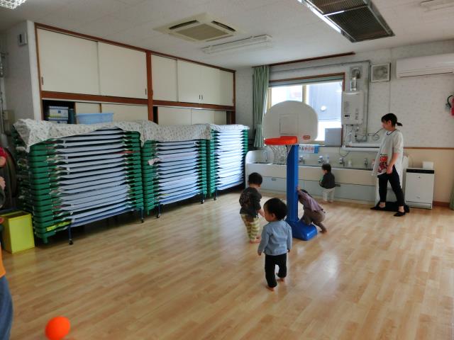 笑顔でハイハイして探索したり、バスケットゴールへ向かってボールを投げてみたり、笑顔で楽しんでいましたよ!