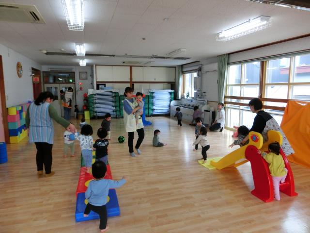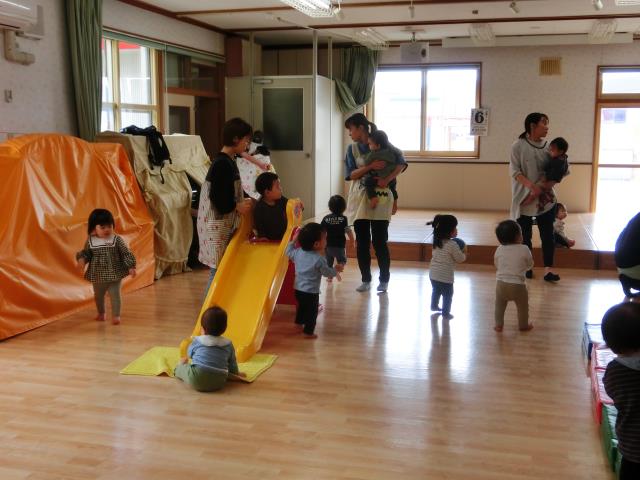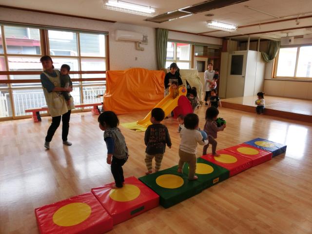 今日のつくしぐみは、みんなでホールへ行って滑り台やボール、JPクッションなどで遊んでいます!
