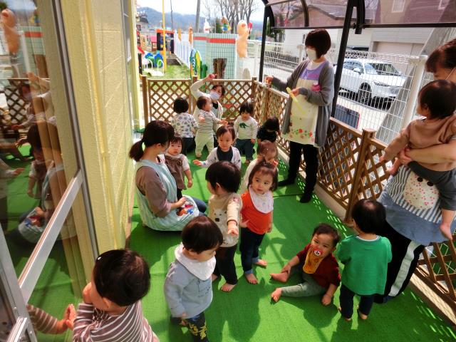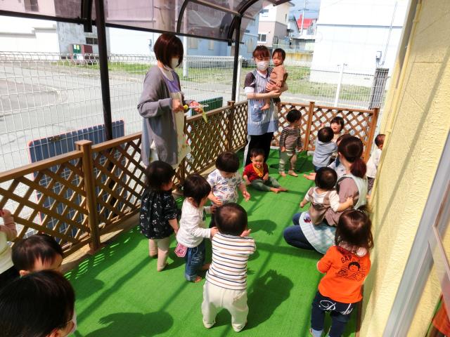 テラスに出たのも初めてだったので、恐る恐る外へ出る子もいましたが、しゃぼん玉がたくさん飛びはじめると、みんな大喜び!