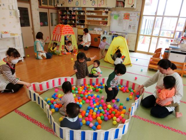 ボールハウスから顔を出したり、ボールの中で手足をバタバタしたり、「えいっ!」とボールをたくさん投げたり。