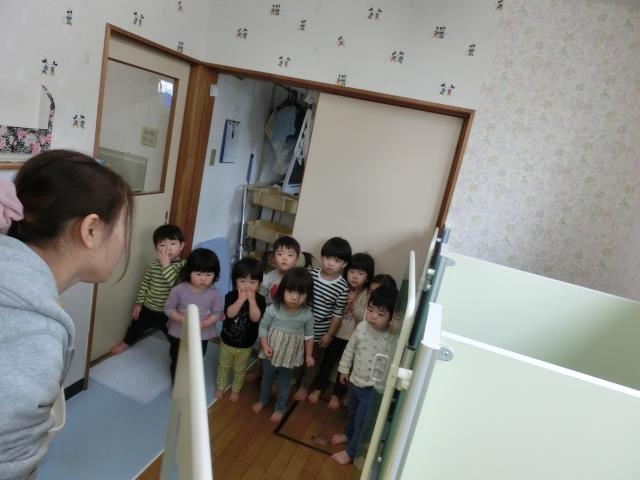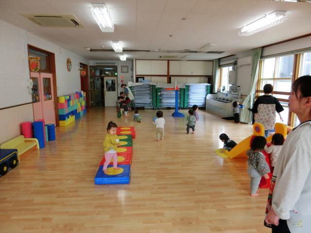 初めは泣いていたお友だちも、広いホールへ行くとピタリと泣き止んでいます。