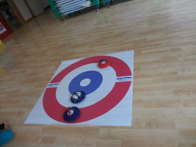 遊び方を教わりまずは保育教諭が行い、その後代表としてすみれぐみのお当番さんがストーンを打ってみました。