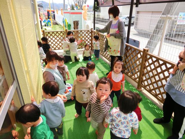 今日のつくしぐみは、お部屋のテラスに出てしゃぼん玉をしました。