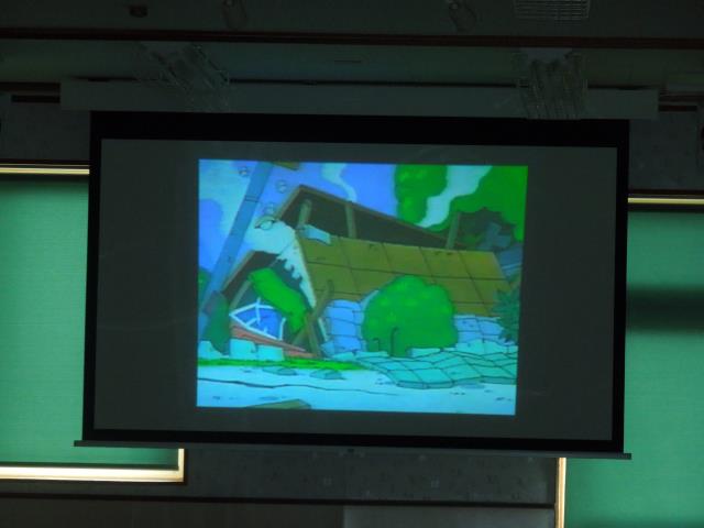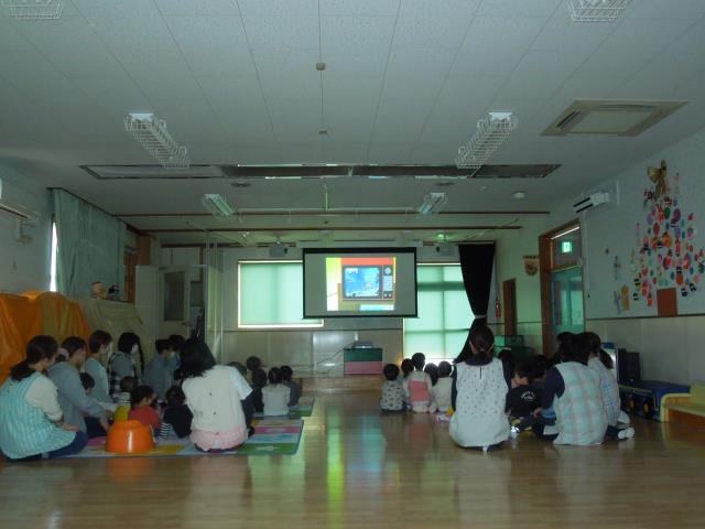 今日は地震の避難訓練として、ホールでDVDを見て学んでいます。