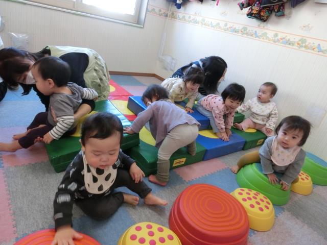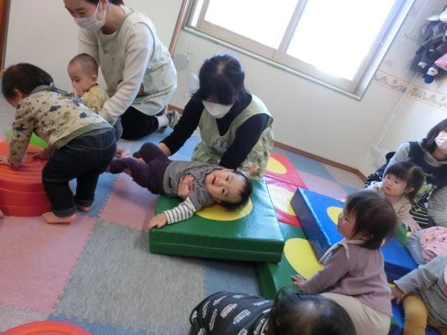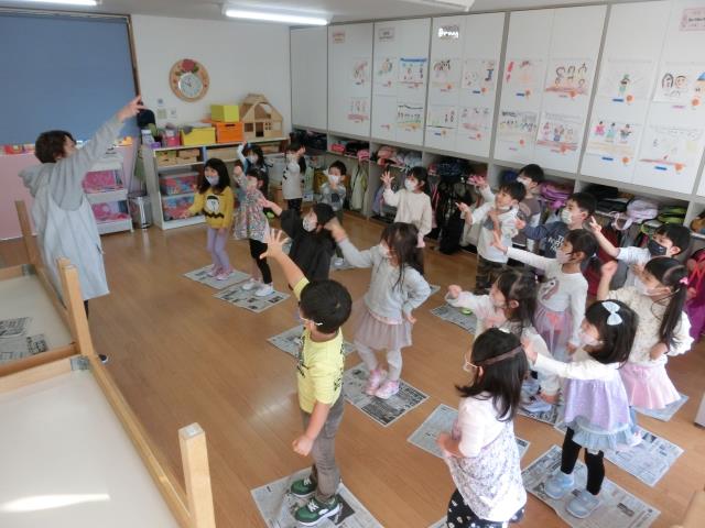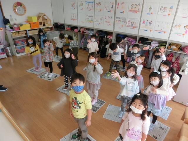 今日のひよこぐみは、お部屋で体を動かして遊びました。